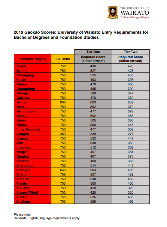 如果你想通过自己的高考成绩申请怀卡托大学的本科课程,你的高考成绩也同样需要达到所在省份的一本线。怀卡托大学去年的文理科高考录取分数线也已经可以查询,大家赶紧来了解一下你要考多少分才能上怀卡托大学。