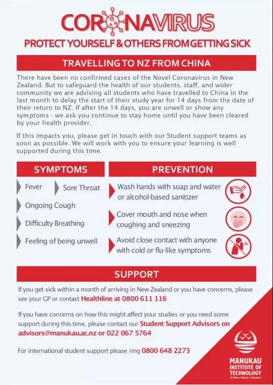 关于新型冠状病毒疫情,我校要求假期回国的学生和新学生到纽后自主隔离14天。隔离期间有关课程和其他任何相关事宜,请电国际部,海外的同学请发邮件至:internationaladmin@manukau.ac.nz 相信我们强大的祖国,一定会战胜疫情