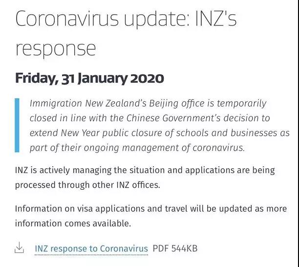 1月31日,新西兰移民局就新型冠状病毒做出回应。在回应中,新西兰移民局表示,因为中国的情况,目前新西兰移民局北京办公室暂时关闭。目前处于一个形势快速变化的阶段,但新西兰移民局致力于确保将因北京办公室关闭而对签证系统带来的影响最小化。同样,移民局也需要确保所有处理对申请者来说是公平的。针对近期递交到北京办公室的学生签证申请,移民局正在想办法分配一些案子到其他移民局办公室,来减少近期北京办公室关闭带来的影响。