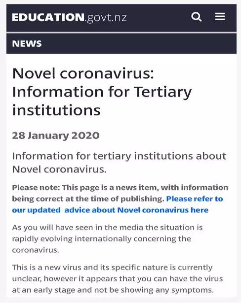 1月27/28号,新西兰教育部连续在官网针对中小学及高等教育院校发布了新型冠状病毒预防和处理指南 http://www.education.govt.nz/news/novel-coronavirus。